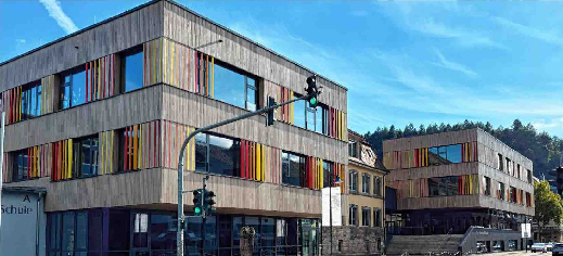 Fassaden, die in Hausach bleibend an die Firma Holzbau Baumann erinnern werden: die GrafHeinrich-Schule, ein Wohnhaus Im Dietersbach und das Kinzigtalbad. Fotos: C. Ramsteiner/Iris Rothe